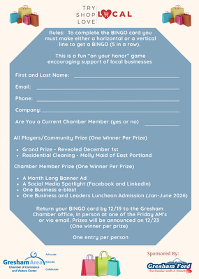 Kick off the holiday shopping season by shopping LOCAL! ! Pick up a BINGO card, shop at local stores to complete 5 in a row, then turn in the completed card for a change to win a fun prize from the Chamber! This is a fun "on your honor" game to encourage supporting your local businesses.