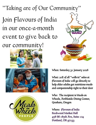 Guided by our commitment to integrity and our role as active members of the Gresham Area Chamber of Commerce, we strive to be a business that leads with vision and heart. Today, Flavours of India is thrilled to announce a new initiative to give back: "Taking Care of Our Community."